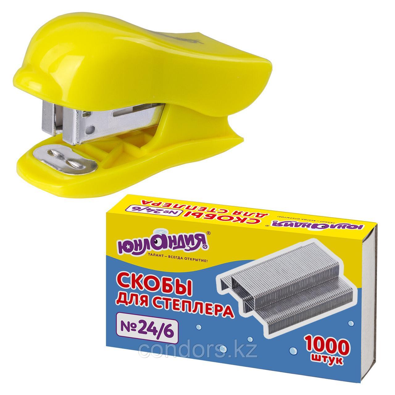 Для скрепления до 20 листов бумаги. В комплекте со степлером поставляются скобы №24/6 в количестве 1000 штук. Глубина закладки бумаги - 22 мм. Закрытый и прямой виды сшивания. Оснащен антистеплером. За счет компактных размеров не займет на парте или столе много места, а яркий желтый или голубой цвет и напоминающая дельфина форма скрасят время ребенка на уроках или при написании домашней работы.Степлер ЮНЛАНДИЯ высокого качества надолго станет незаменимым помощником при написании творческих работ.